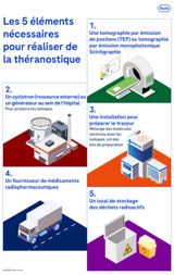 Pour la réalisation de cette prise en charge, les services de médecines nucléaires doivent disposer de caméras (TEP/TEMP) mais aussi d’espaces de traitement. Selon le type de radionucléides, donc de médicaments radiopharmaceutiques utilisés, il peut s’agir de chambres ou box radioprotégées. Des systèmes de cuves pour le recueil des urines des patients peuvent aussi être nécessaires.